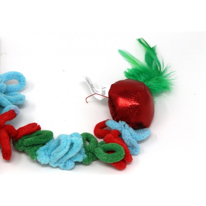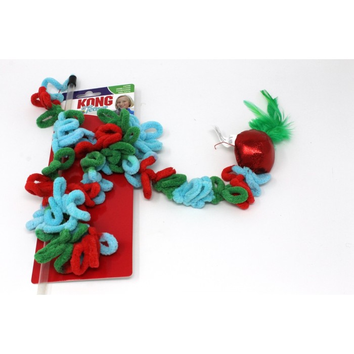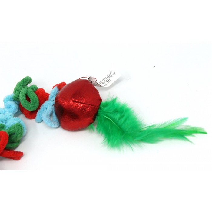 This teaser has a shiny soft ball with feather dangling from a looped, soft cord.