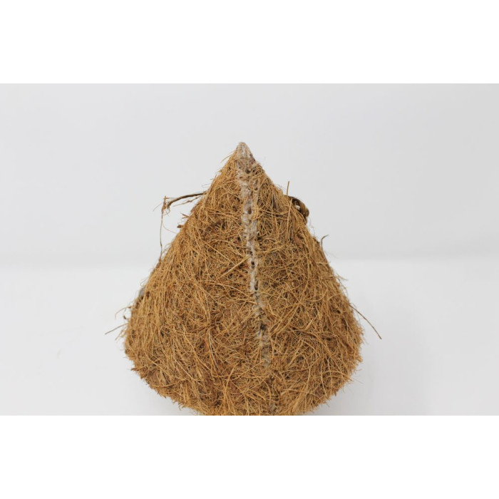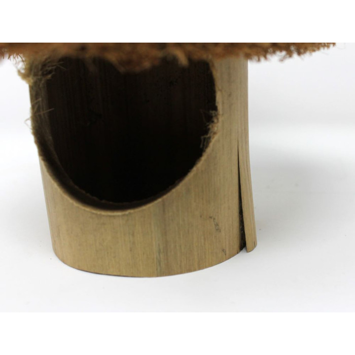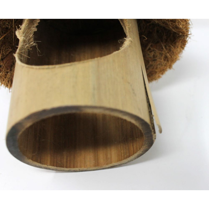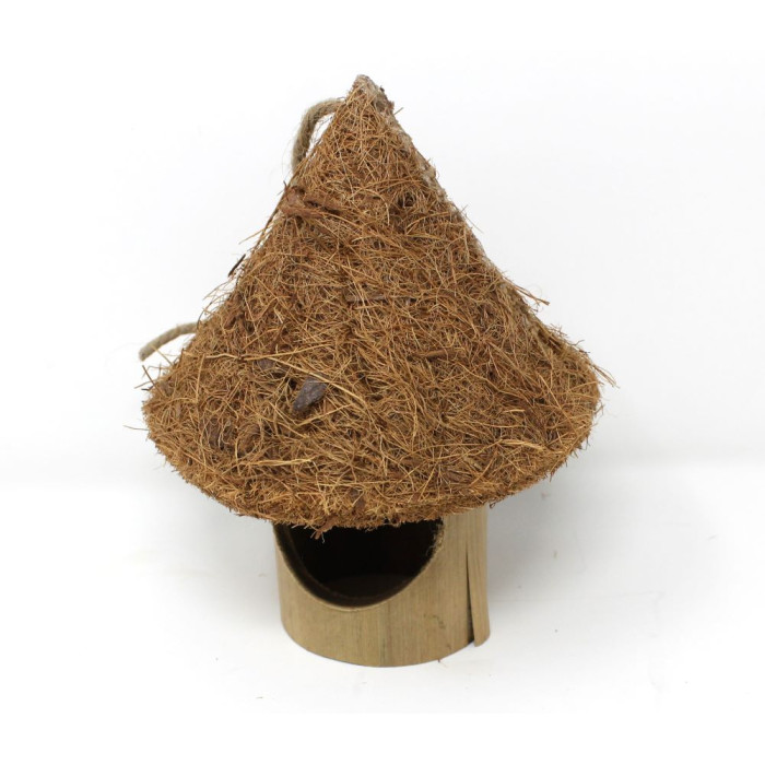 Small hut made from a slice of bamboo with a round entry hole topped with a pressed coco fibre roof.