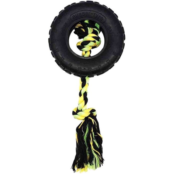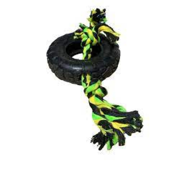 A tough and durable tyre chew toy made from rubber, with the addition of a rope tugger.