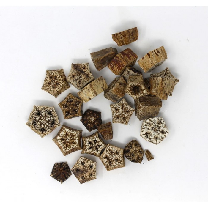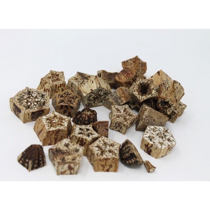Smaller sized chew toy made from mahogany pieces, palm leaf stars and wooden beads. Natural material..