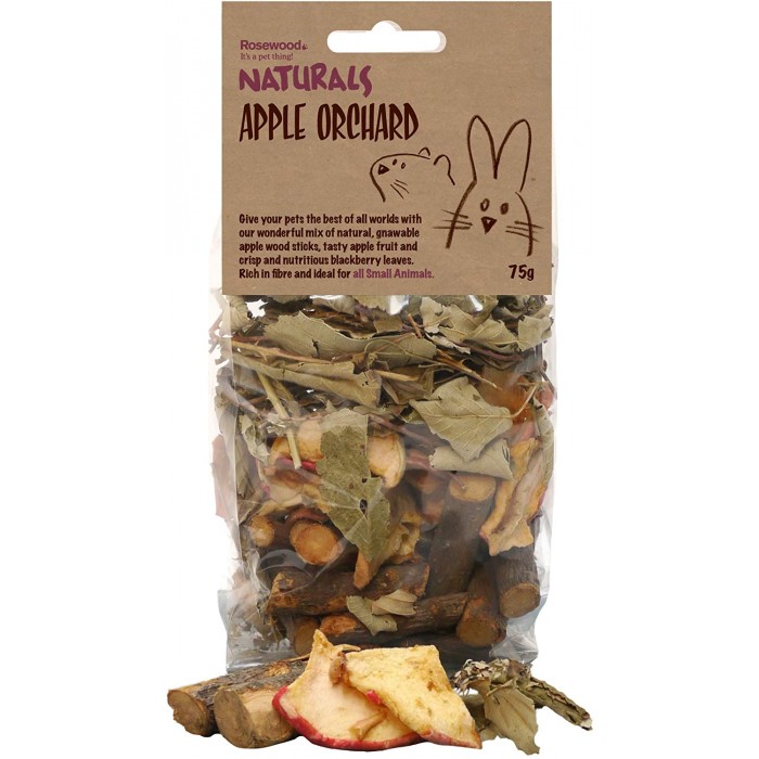 A delicious mix of apple pieces, apple wood nibble sticks and crisp and nutritious blackberry leaves. Rich in fibre and readily accepted by all small pets and cage birds.