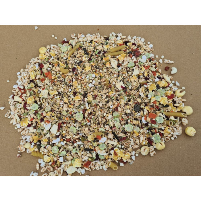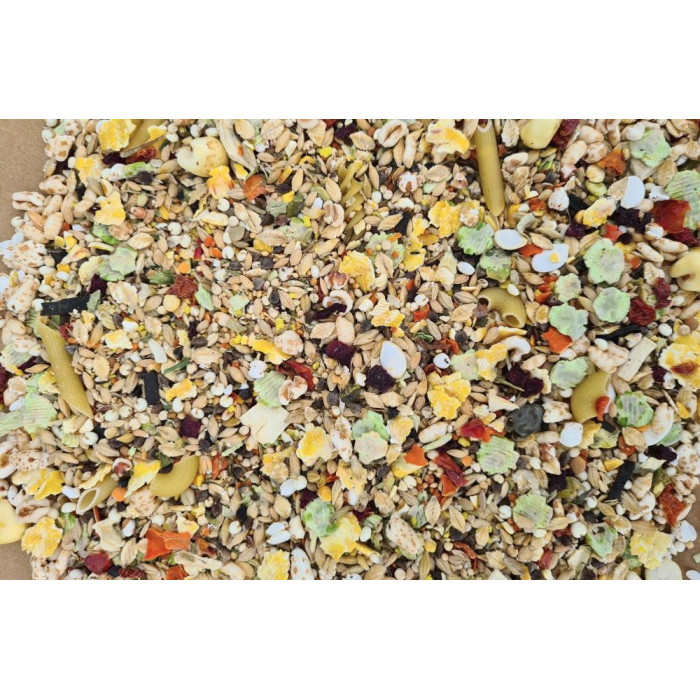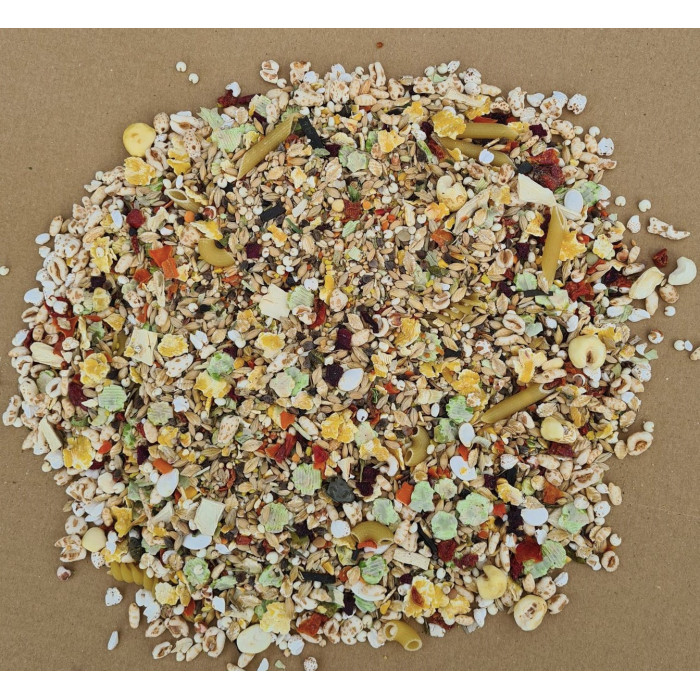• Paddy rice, flaked barley, whole barley, flaked maize, flaked peas, white dari, buckwheat, mixed millet, seed mixture (fennel, milk thistle, pumpkin seed, hemp, linseed, white quinoa), egg food, mixed puffs (millet, rice, buckwheat, popcorn), pasta, maize grits , lentils, flaked carrot, dried mixed vegetables, dandelion leaves, kelp pieces, beetroot pieces, pepper flakes, tomato flakes, garlic granules