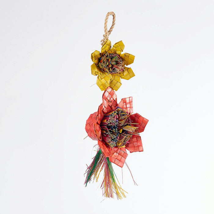 Woven palm leaf chew toy with brightly coloured sisal threads to encourage preening behaviour.