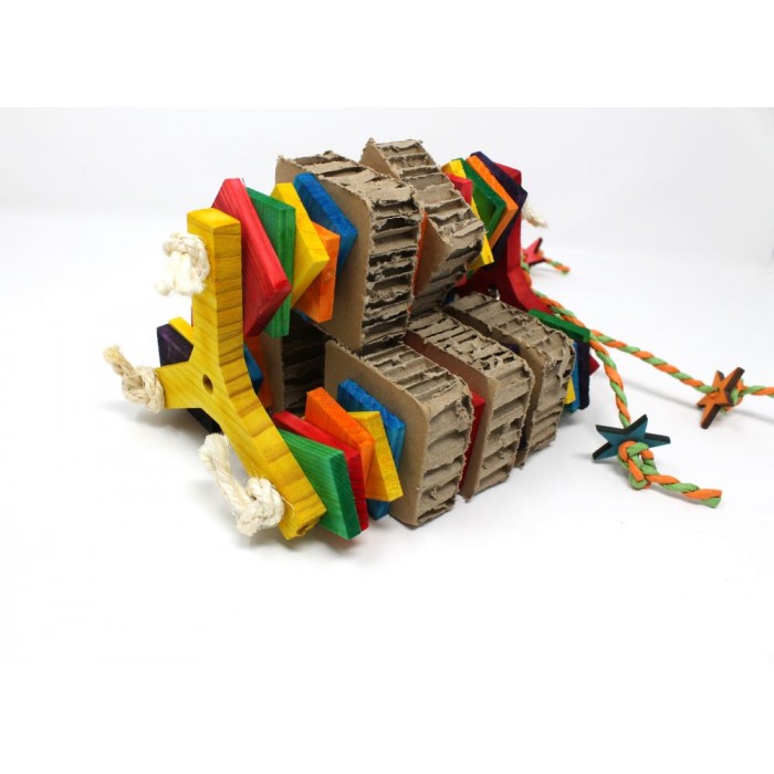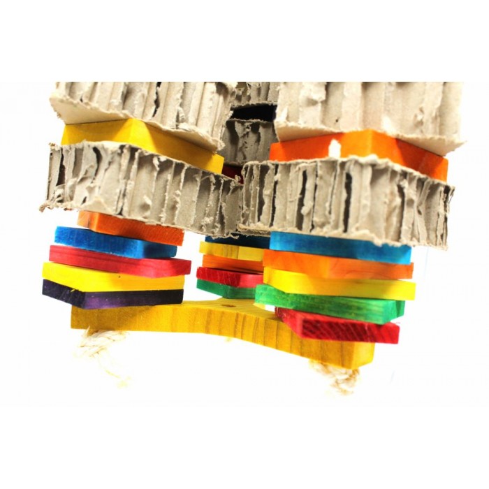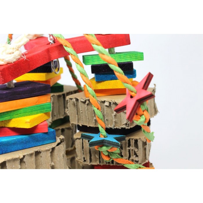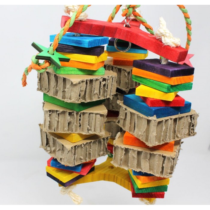 A medium sized hanging toy made from coloured pine shapes and chunky corrugated cardboard chunks threaded onto sisal rope. Twisted paper cord and pine stars add further chewing fun.