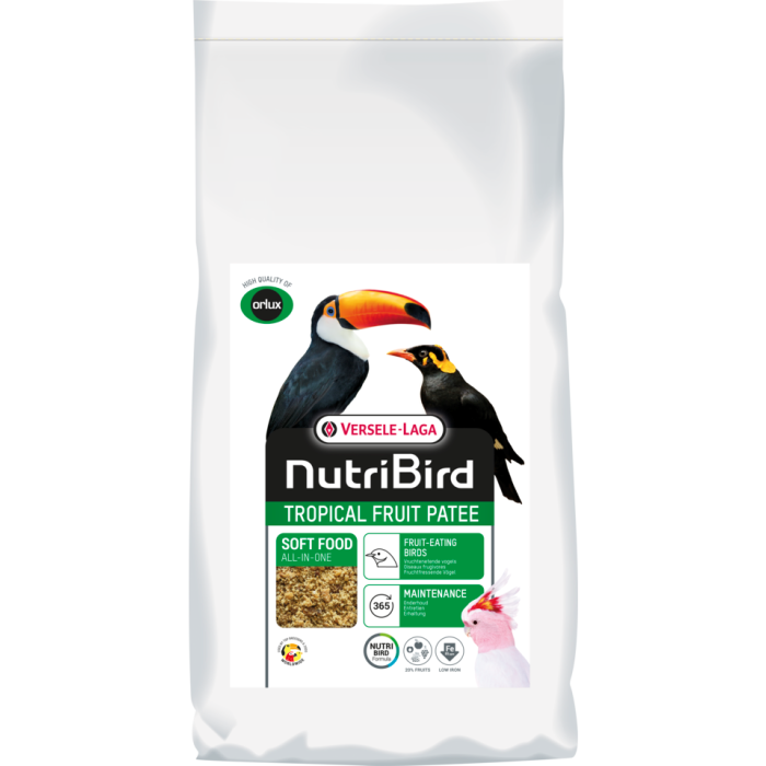 Orlux Tropical Fruit Patee is a balanced food for all fruit-eating birds. It is also an additional food for large parakeets, parrots, fig parrots and lorikeets.